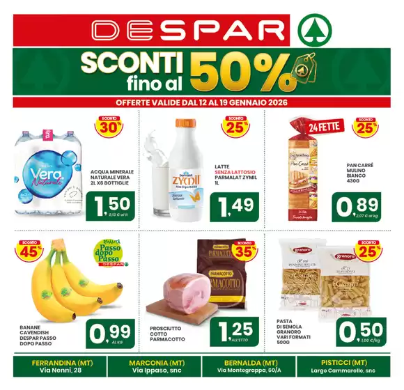 Non perdere l'opportunità di visitare il negozio Despar a Via Montegrappa per un'esperienza di acquisto completa. Ti invitiamo a esplorare le promozioni che abbiamo per te questo gennaio e a rimanere aggiornato sulle migliori offerte di Despar a Bernalda. Vieni a trovarci e inizia a risparmiare oggi stesso!
