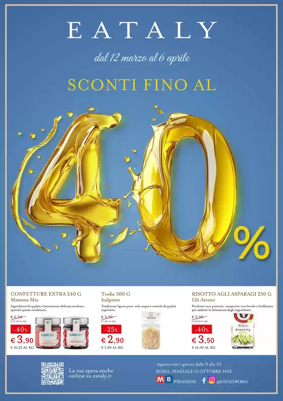 Non perdere l'opportunità di visitare il negozio Eataly a Piazzale Xii Ottobre, 1492 per un'esperienza di acquisto completa. Ti invitiamo a esplorare le promozioni che abbiamo per te questo marzo e a rimanere aggiornato sulle migliori offerte di Eataly a Roma. Vieni a trovarci e inizia a risparmiare oggi stesso!