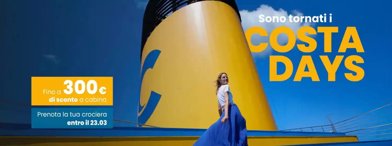 Benvenuto nel negozio Costa Crociere su Tiendeo, dove potrai scoprire le migliori offerte, promozioni e cataloghi di questo marchio rinomato nel settore di Viaggi. Il nostro negozio fisico si trova a Via Garibaldi, 9/A, Verona, e lì troverai un'ampia gamma di prodotti di qualità che ti permetteranno di risparmiare durante tutto il marzo 2026.