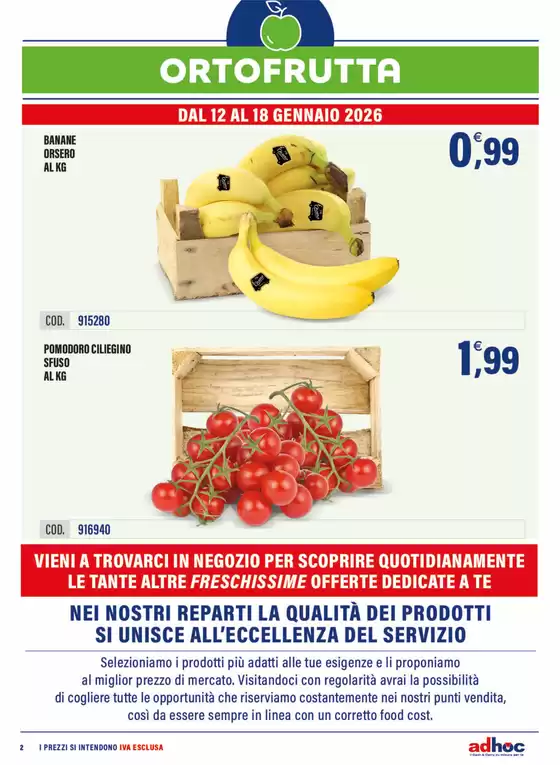 Adhoc è un’insegna cash & carry riservata ai soli professionisti del settore HORECA, presente in Campania, con un posizionamento di prodotti e servizi focalizzati su qualità e convenienza. Il catalogo Adhoc comprende un ampio assortimento composto da oltre 10mila referenze per il settore alimentare con un’attenzione particolare alle specificità territoriali in cui si trovano i punti vendita. Un assortimento completo che rappresenta le realtà locali e nazionali, con uno sguardo alle tendenze globali, costruito sulle esigenze dei clienti, con prezzi Adhoc, promozioni imbattibili e tante altre opportunità su misura per risparmiare con semplicità tutto l’anno. Allinterno dei cash&carry Adhoc sono presenti i reparti freschissimi con prodotti selezionati, controllati e certificati. Nei reparti con arrivi giornalieri è possibile trovare prodotti ittici freschissimi, sia pescati sia allevati, carni nazionali ed estere nonché prodotti ortofrutticoli altamente selezionati da Adhoc per offrire qualità e convenienza. Completano l’assortimento i reparti dei salumi, formaggi e prodotti gastronomici, il mondo dei surgelati, l’enoteca professionale ed il beverage. Oggi l’azienda conta 6 punti vendita sul territorio campano. Potrete consultare gli orari Adhoce tutte le offerte Adhoc anche su www.tiendeo.it.