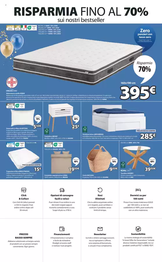 Se vuoi essere sempre il primo ad essere informato sulle nuove promozioni e sulle ultime tendenze nel campo dellarredamento, iscriviti alla newsletter di Tiendeo e verrai avvisato immediatamente delluscita dellultimo volantino, di JYSK; sfoglialo online, scegli comodamente i tuoi articoli preferiti e recati nel negozio JYSK più vicino. Scarica gratis lapp di Tiendeo per conoscere gli orari di apertura e di chiusura. Se il negozio è chiuso non ti preoccupare: potrai acquistare i prodotti JYSK direttamente da casa tua nel nellonline shop JYSK.it