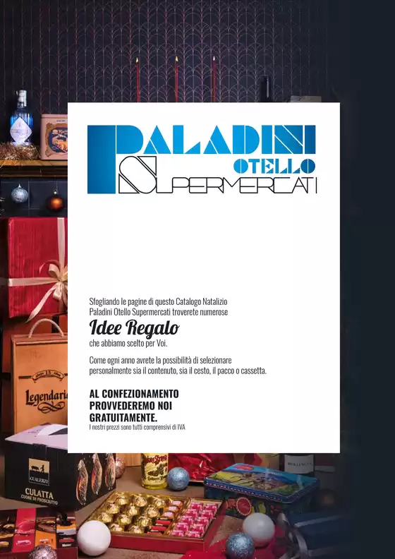 Rapporto qualità prezzo; ampio assortimento; alta specializzazione dei reparti vini, liquori, salumi, formaggi e scatolame sono i punti di forza dai quali l’azienda parte per soddisfare in modo trasversale tutte le tipologie di spesa. I 6 punti di vendita sono a gestione diretta, non sono associati a nessuna centrale d’acquisto e nessuna insegna. Paladini Otello Supermercati collabora con le migliori marche garantendo alta qualità sempre a prezzi molto competitivi. Non solo. Nei supermercati Paladini Otello è possibile regalare una spesa acquistando buoni acquisto in tagli da 25, 50, 100 Euro dietro emissione di regolare fattura. I buoni sono validi per un anno e sono spendibili presso tutti i punti di vendita dei Supermercati Paladini Otello. Inoltre per i pubblici esercizi i supermercati Paladini Otello effettuano consegne gratuite a domicilio. Per maggiori informazioni potete contattare il punto di vendita più vicino. Inoltre durante tutto l’anno il confezionamento dei regali sarà gratuito.