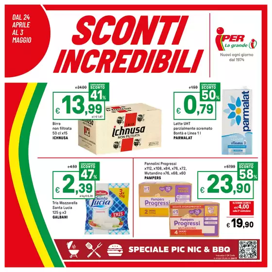 Iper La grande è una catena di iper e supermercati presente in Nord e Centro Italia che offre articoli di vario genere ad un prezzo conveniente, prestando principalmente attenzione ai prodotti locali e affini ai valori etici del marchio. Presso i negozi Iper La grande troverai diversi servizi, tra cui parafarmacie, negozi di ottica, negozi per animali, aree svago, punti di ristorazione e servizi di stampa fotografica. Su Tiendeo avrai accesso al volantino Iper La grande i per non perderti nessun’offerta nei punti vendita della tua città!