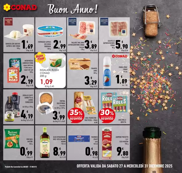 Conad, acronimo di Consorzio Nazionale Dettaglianti, è una società cooperativa fondata a Bologna e attiva dal 1962. Ad oggi Conad presenta oltre 3.000 punti vendita e 5.000 prodotti in assortimento, garantendo ogni giorno qualità e prezzi convenienti alla sua clientela. Conad offre format per ogni esigenza da iper e supermercati a punti vendita di minori dimensioni come Margherita Conad e Todis. Inoltre la clientela Conad può usufruire del servizio di spesa online HeyConad, che permette di ricevere l’ordine direttamente a casa tramite consegna a domicilio o ritirarlo presso uno dei punti vendita. Consulta l’anteprima del volantino Conad disponibile su Tiendeo e scopri maggiori informazioni su promozioni e servizi della catena.