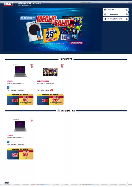 Trony è una catena italiana specializzata nella vendita di articoli di elettronica di consumo e hi-tech, con oltre 200 punti vendita distribuiti sul territorio. Il catalogo Trony conta migliaia di referenze e comprende le migliori marche nei settori dell’informatica, degli elettrodomestici, della telefonia, TV, audio e videogiochi. L’azienda offre anche la possibilità di acquistare online in modo facile e intuitivo.
