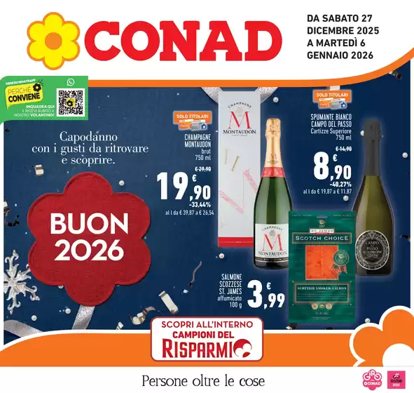 Conad, acronimo di Consorzio Nazionale Dettaglianti, è una società cooperativa fondata a Bologna e attiva dal 1962. Ad oggi Conad presenta oltre 3.000 punti vendita e 5.000 prodotti in assortimento, garantendo ogni giorno qualità e prezzi convenienti alla sua clientela. Conad offre format per ogni esigenza da iper e supermercati a punti vendita di minori dimensioni come Margherita Conad e Todis. Inoltre la clientela Conad può usufruire del servizio di spesa online HeyConad, che permette di ricevere l’ordine direttamente a casa tramite consegna a domicilio o ritirarlo presso uno dei punti vendita. Consulta l’anteprima del volantino Conad disponibile su Tiendeo e scopri maggiori informazioni su promozioni e servizi della catena.