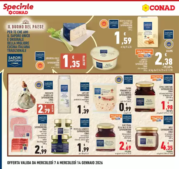 Conad, acronimo di Consorzio Nazionale Dettaglianti, è una società cooperativa fondata a Bologna e attiva dal 1962. Ad oggi Conad presenta oltre 3.000 punti vendita e 5.000 prodotti in assortimento, garantendo ogni giorno qualità e prezzi convenienti alla sua clientela. Conad offre format per ogni esigenza da iper e supermercati a punti vendita di minori dimensioni come Margherita Conad e Todis. Inoltre la clientela Conad può usufruire del servizio di spesa online HeyConad, che permette di ricevere l’ordine direttamente a casa tramite consegna a domicilio o ritirarlo presso uno dei punti vendita. Consulta l’anteprima del volantino Conad disponibile su Tiendeo e scopri maggiori informazioni su promozioni e servizi della catena.