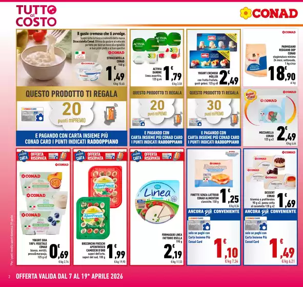 Conad, acronimo di Consorzio Nazionale Dettaglianti, è una società cooperativa fondata a Bologna e attiva dal 1962. Ad oggi Conad presenta oltre 3.000 punti vendita e 5.000 prodotti in assortimento, garantendo ogni giorno qualità e prezzi convenienti alla sua clientela. Conad offre format per ogni esigenza da iper e supermercati a punti vendita di minori dimensioni come Margherita Conad e Todis. Inoltre la clientela Conad può usufruire del servizio di spesa online HeyConad, che permette di ricevere l’ordine direttamente a casa tramite consegna a domicilio o ritirarlo presso uno dei punti vendita. Consulta l’anteprima del volantino Conad disponibile su Tiendeo e scopri maggiori informazioni su promozioni e servizi della catena.