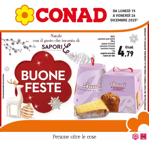 Conad, acronimo di Consorzio Nazionale Dettaglianti, è una società cooperativa fondata a Bologna e attiva dal 1962. Ad oggi Conad presenta oltre 3.000 punti vendita e 5.000 prodotti in assortimento, garantendo ogni giorno qualità e prezzi convenienti alla sua clientela. Conad offre format per ogni esigenza da iper e supermercati a punti vendita di minori dimensioni come Margherita Conad e Todis. Inoltre la clientela Conad può usufruire del servizio di spesa online HeyConad, che permette di ricevere l’ordine direttamente a casa tramite consegna a domicilio o ritirarlo presso uno dei punti vendita. Consulta l’anteprima del volantino Conad disponibile su Tiendeo e scopri maggiori informazioni su promozioni e servizi della catena.