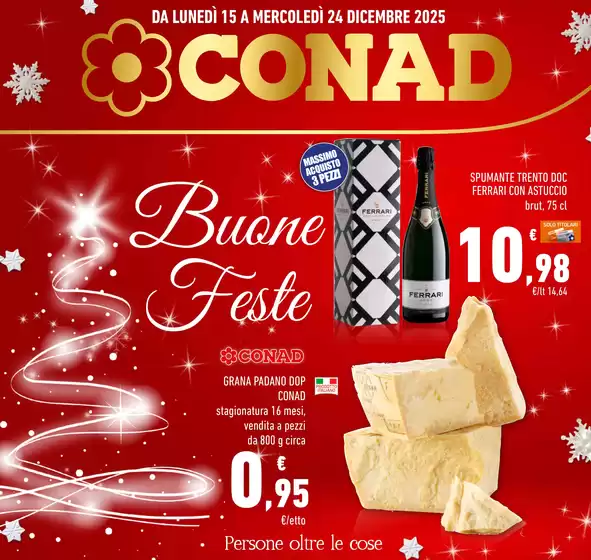 Conad, acronimo di Consorzio Nazionale Dettaglianti, è una società cooperativa fondata a Bologna e attiva dal 1962. Ad oggi Conad presenta oltre 3.000 punti vendita e 5.000 prodotti in assortimento, garantendo ogni giorno qualità e prezzi convenienti alla sua clientela. Conad offre format per ogni esigenza da iper e supermercati a punti vendita di minori dimensioni come Margherita Conad e Todis. Inoltre la clientela Conad può usufruire del servizio di spesa online HeyConad, che permette di ricevere l’ordine direttamente a casa tramite consegna a domicilio o ritirarlo presso uno dei punti vendita. Consulta l’anteprima del volantino Conad disponibile su Tiendeo e scopri maggiori informazioni su promozioni e servizi della catena.
