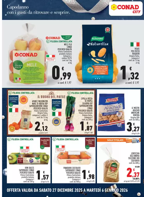 Conad è una catena italiana di supermercati e ipermercati che opera nel settore della Grande Distribuzione Organizzata, formata da 8 gruppi cooperativi. Il catalogo Conad City coniuga la facilità della spesa vicino casa con la completezza dell’assortimento e la qualità. Comprende prodotti alimentari, bevande, gastronomia, ortofrutta pronta alluso, panetteria e prodotti tipici regionali. Le linee di articoli a marchio proprio spaziano dalle eccellenze di Sapori&Dintorni, ai prodotti Conad Kids per il bambino, Conad Verso Natura, Alimentum e Piacersi.