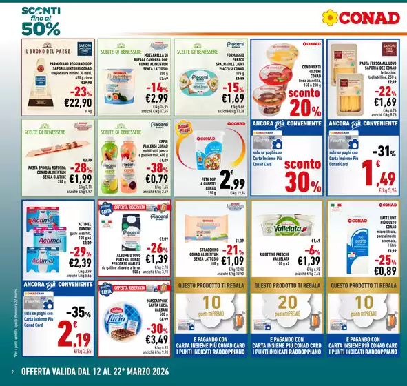 Conad, acronimo di Consorzio Nazionale Dettaglianti, è una società cooperativa fondata a Bologna e attiva dal 1962. Ad oggi Conad presenta oltre 3.000 punti vendita e 5.000 prodotti in assortimento, garantendo ogni giorno qualità e prezzi convenienti alla sua clientela. Conad offre format per ogni esigenza da iper e supermercati a punti vendita di minori dimensioni come Margherita Conad e Todis. Inoltre la clientela Conad può usufruire del servizio di spesa online HeyConad, che permette di ricevere l’ordine direttamente a casa tramite consegna a domicilio o ritirarlo presso uno dei punti vendita. Consulta l’anteprima del volantino Conad disponibile su Tiendeo e scopri maggiori informazioni su promozioni e servizi della catena.