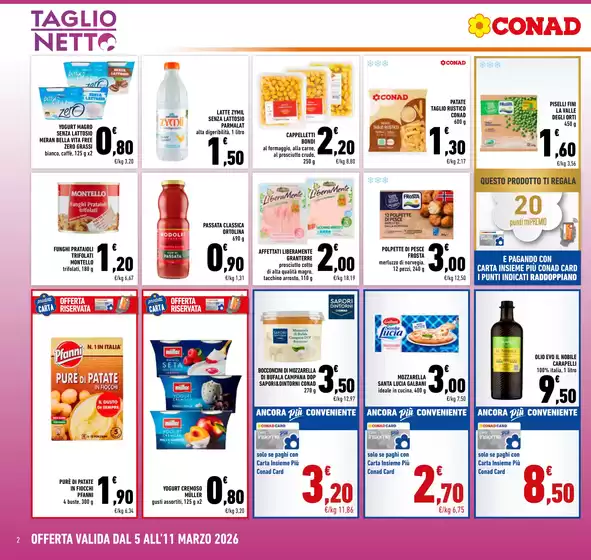 Conad, acronimo di Consorzio Nazionale Dettaglianti, è una società cooperativa fondata a Bologna e attiva dal 1962. Ad oggi Conad presenta oltre 3.000 punti vendita e 5.000 prodotti in assortimento, garantendo ogni giorno qualità e prezzi convenienti alla sua clientela. Conad offre format per ogni esigenza da iper e supermercati a punti vendita di minori dimensioni come Margherita Conad e Todis. Inoltre la clientela Conad può usufruire del servizio di spesa online HeyConad, che permette di ricevere l’ordine direttamente a casa tramite consegna a domicilio o ritirarlo presso uno dei punti vendita. Consulta l’anteprima del volantino Conad disponibile su Tiendeo e scopri maggiori informazioni su promozioni e servizi della catena.