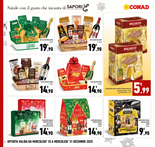 Conad, acronimo di Consorzio Nazionale Dettaglianti, è una società cooperativa fondata a Bologna e attiva dal 1962. Ad oggi Conad presenta oltre 3.000 punti vendita e 5.000 prodotti in assortimento, garantendo ogni giorno qualità e prezzi convenienti alla sua clientela. Conad offre format per ogni esigenza da iper e supermercati a punti vendita di minori dimensioni come Margherita Conad e Todis. Inoltre la clientela Conad può usufruire del servizio di spesa online HeyConad, che permette di ricevere l’ordine direttamente a casa tramite consegna a domicilio o ritirarlo presso uno dei punti vendita. Consulta l’anteprima del volantino Conad disponibile su Tiendeo e scopri maggiori informazioni su promozioni e servizi della catena.