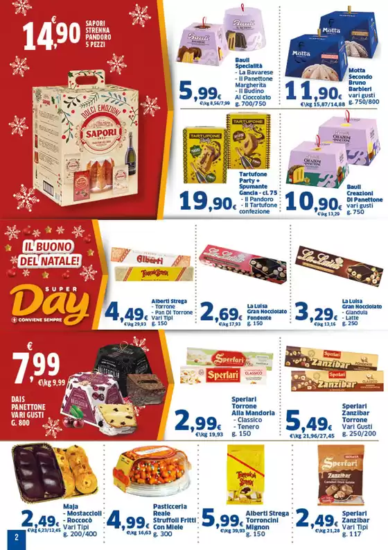 Diventare un cliente Superday conviene sempre: offerte speciali, carta fedeltà, raccolte punti e sconti che non temono confronti. Ogni giorno Superday mette a disposizione tutta la sua professionalità ed esperienza, per soddisfare ogni esigenza con trasparenza e cortesia. Il catalogo Superday comprende un assortimento di prodotti alimentari e non food, per tutti coloro che hanno necessità di una spesa rapida con una frequenza quotidiana. Tutto per la spesa quotidiana: Super Day offre freschezza, qualità e un’incredibile varietà, sempre allinsegna della convenienza. Il supermercato è costituito da reparti organizzati per la vendita al dettaglio di prodotti alimentari, articoli per ligiene personale e della casa, frutta e verdura stagionali e surgelati delle migliori marche. Il reparto panetteria, inoltre, sforna ogni giorno pane fragrante, baguette, focacce, pasticceria e pizze gustose. In un ambiente accogliente e rilassante, lasciatevi ispirare dalle tante proposte invitanti: dai piatti pronti da portar via per la pausa pranzo fino ai salumi e formaggi tipici per stupire i vostri ospiti a cena.