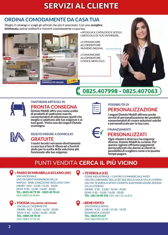 Dotolo Mobili è un’azienda italiana, leader in Campania e nel Sud Italia, specializzata nella vendita di mobili e complementi d’arredo. Oggi conta un enorme ed elegantissimo show-room di 15.000 mq a Passo di Mirabella Eclano, in Campania, in provincia di Avellino, dove accoglienza e cortesia regnano sempre sovrane, ed è affiancato dalle altre sedi di Benevento, Foggia e Bellizzi (Salerno), per un totale di 30.000 mq ed oltre 60 dipendenti operanti nei 4 punti vendita. Nel corso dei decenni migliaia di famiglie e coppie di sposi hanno deciso di arredare le loro case preferendo i prodotti di Dotolo Mobili; una scommessa imprenditoriale abbondantemente vinta grazie alla qualità dell’offerta e soprattutto al gradevolissimo rapporto di fiducia instaurato giorno dopo giorno con la clientela. Oggi come ieri, un’etica comportamentale corretta e la capacità di proporre sempre la soluzione più idonea e conveniente rappresentano i valori prioritari e imprescindibili sui quali la famiglia Dotolo ha tracciato, nel tempo, il solco del suo successo commerciale. Il catalogo Dotolo Mobili comprende il meglio del design creato dai più importanti marchi italiani del settore: dalle cucine agli ambienti giorno, dalle camere da letto a quelle per bambini, dai divani alle poltrone-relax, ai materassi. L’azienda offre la possibilità di acquistare online attraverso il sito www.dotolomobili.it ottenere il prodotto con un servizio di consegna a domicilio. Potrete consultare gli orari Dotolo Mobili e tutte le offerte Dotolo Mobili su www.tiendeo.it.