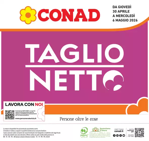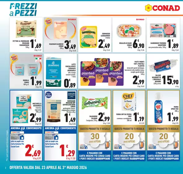 Conad, acronimo di Consorzio Nazionale Dettaglianti, è una società cooperativa fondata a Bologna e attiva dal 1962. Ad oggi Conad presenta oltre 3.000 punti vendita e 5.000 prodotti in assortimento, garantendo ogni giorno qualità e prezzi convenienti alla sua clientela. Conad offre format per ogni esigenza da iper e supermercati a punti vendita di minori dimensioni come Margherita Conad e Todis. Inoltre la clientela Conad può usufruire del servizio di spesa online HeyConad, che permette di ricevere l’ordine direttamente a casa tramite consegna a domicilio o ritirarlo presso uno dei punti vendita. Consulta l’anteprima del volantino Conad disponibile su Tiendeo e scopri maggiori informazioni su promozioni e servizi della catena.