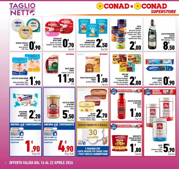 Conad è una catena italiana di supermercati e ipermercati che opera nel settore della Grande Distribuzione Organizzata, formata da 8 gruppi cooperativi. Il catalogo Conad Superstore coniuga la facilità della spesa vicino casa con la completezza dell’assortimento ed i maggiori servizi di aree commerciali ampie. Comprende prodotti alimentari, bevande, articoli per l’igiene e per la casa, hobby e giardinaggio. Le linee di articoli a marchio proprio spaziano dalle eccellenze di Sapori&Dintorni, ai prodotti Conad Kids per il bambino, Conad Verso Natura, Alimentum e Piacersi.
