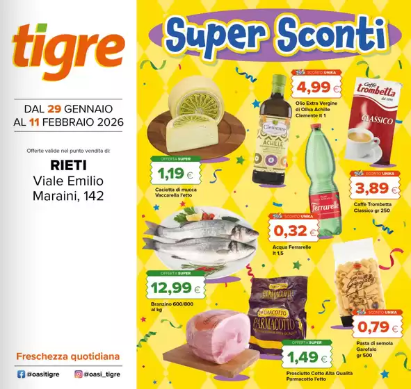 I punti vendita Supermercati Tigre sono una catena italiana della Grande Distribuzione presente nel Centro e Sud Italia attraverso una rete capillare di piccoli negozi e superette. Il catalogo Supermercati Tigre comprende un ampio assortimento di prodotti alimentari e non food, con un’accurata selezione dei freschi e particolare attenzione ai prodotti tipici ed enogastronomici.