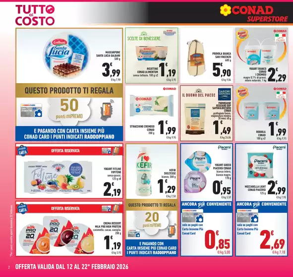 Conad è una catena italiana di supermercati e ipermercati che opera nel settore della Grande Distribuzione Organizzata, formata da 8 gruppi cooperativi. Il catalogo Conad Superstore coniuga la facilità della spesa vicino casa con la completezza dell’assortimento ed i maggiori servizi di aree commerciali ampie. Comprende prodotti alimentari, bevande, articoli per l’igiene e per la casa, hobby e giardinaggio. Le linee di articoli a marchio proprio spaziano dalle eccellenze di Sapori&Dintorni, ai prodotti Conad Kids per il bambino, Conad Verso Natura, Alimentum e Piacersi.
