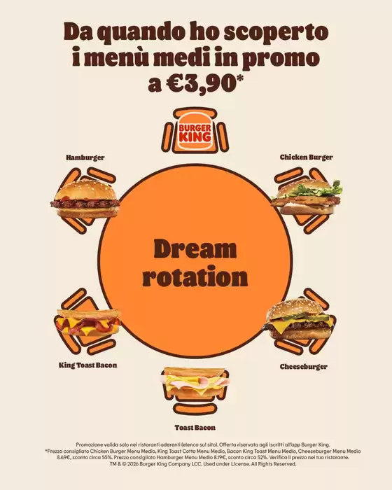 Burger King è una catena internazionale di ristoranti fast food con 11 milioni di clienti giornalieri e più di 13.000 punti vendita. Il catalogo Burger King comprende diversi prodotti alimentari. Il più noto è certamente un hamburger di carne bovina di grandi dimensioni, cotto al momento sulla griglia, chiamato WHOPPER® ma anche crocchette e hamburger di pollo, anelli di cipolla fritti, snack, verdure, desserts e caffè.