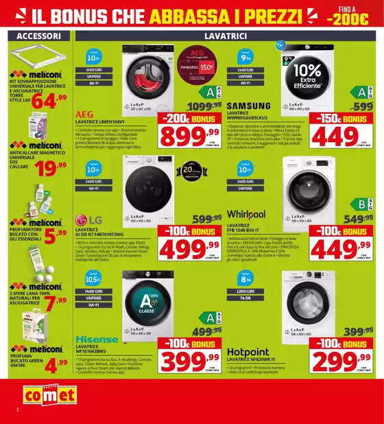Comet è unazienda italiana con sede a Bologna attiva dal 1967 che offre elettrodomestici ed elettronica di consumo a privati e materiale elettrico a clienti professionali, industria ed enti pubblici. Comet conta più di 100 negozi fisici nel centro e nord Italia e un negozio online, tramite il quale si possono ordinare i prodotti con consegna a domicilio o ritirarli nel punto vendita più vicino. Visualizza il volantino Comet su Tiendeo e non perderti nessuna promozione e novità della catena.