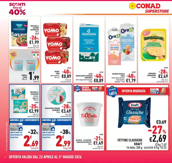 Conad è una catena italiana di supermercati e ipermercati che opera nel settore della Grande Distribuzione Organizzata, formata da 8 gruppi cooperativi. Il catalogo Conad Superstore coniuga la facilità della spesa vicino casa con la completezza dell’assortimento ed i maggiori servizi di aree commerciali ampie. Comprende prodotti alimentari, bevande, articoli per l’igiene e per la casa, hobby e giardinaggio. Le linee di articoli a marchio proprio spaziano dalle eccellenze di Sapori&Dintorni, ai prodotti Conad Kids per il bambino, Conad Verso Natura, Alimentum e Piacersi.