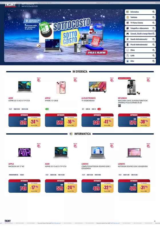 Trony è una catena italiana specializzata nella vendita di articoli di elettronica di consumo e hi-tech, con oltre 200 punti vendita distribuiti sul territorio. Il catalogo Trony conta migliaia di referenze e comprende le migliori marche nei settori dell’informatica, degli elettrodomestici, della telefonia, TV, audio e videogiochi. L’azienda offre anche la possibilità di acquistare online in modo facile e intuitivo.