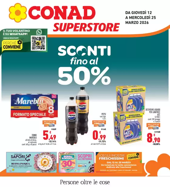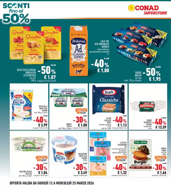 Conad è una catena italiana di supermercati e ipermercati che opera nel settore della Grande Distribuzione Organizzata, formata da 8 gruppi cooperativi. Il catalogo Conad Superstore coniuga la facilità della spesa vicino casa con la completezza dell’assortimento ed i maggiori servizi di aree commerciali ampie. Comprende prodotti alimentari, bevande, articoli per l’igiene e per la casa, hobby e giardinaggio. Le linee di articoli a marchio proprio spaziano dalle eccellenze di Sapori&Dintorni, ai prodotti Conad Kids per il bambino, Conad Verso Natura, Alimentum e Piacersi.