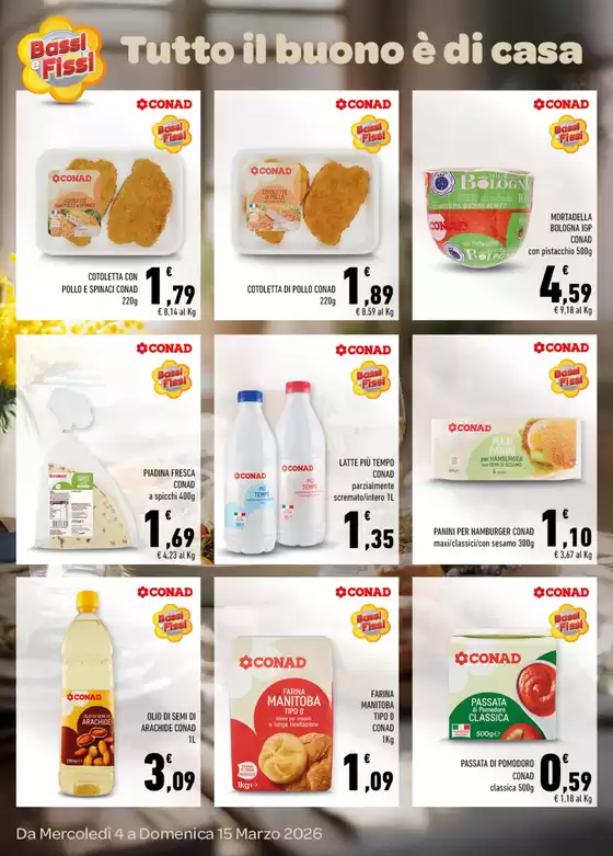 Conad, acronimo di Consorzio Nazionale Dettaglianti, è una società cooperativa fondata a Bologna e attiva dal 1962. Ad oggi Conad presenta oltre 3.000 punti vendita e 5.000 prodotti in assortimento, garantendo ogni giorno qualità e prezzi convenienti alla sua clientela. Conad offre format per ogni esigenza da iper e supermercati a punti vendita di minori dimensioni come Margherita Conad e Todis. Inoltre la clientela Conad può usufruire del servizio di spesa online HeyConad, che permette di ricevere l’ordine direttamente a casa tramite consegna a domicilio o ritirarlo presso uno dei punti vendita. Consulta l’anteprima del volantino Conad disponibile su Tiendeo e scopri maggiori informazioni su promozioni e servizi della catena.