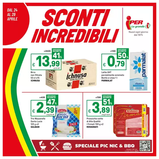Iper La grande è una catena di iper e supermercati presente in Nord e Centro Italia che offre articoli di vario genere ad un prezzo conveniente, prestando principalmente attenzione ai prodotti locali e affini ai valori etici del marchio. Presso i negozi Iper La grande troverai diversi servizi, tra cui parafarmacie, negozi di ottica, negozi per animali, aree svago, punti di ristorazione e servizi di stampa fotografica. Su Tiendeo avrai accesso al volantino Iper La grande i per non perderti nessun’offerta nei punti vendita della tua città!