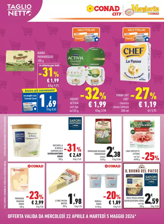 Conad è una catena italiana di supermercati e ipermercati che opera nel settore della Grande Distribuzione Organizzata, formata da 8 gruppi cooperativi. Il catalogo Conad City coniuga la facilità della spesa vicino casa con la completezza dell’assortimento e la qualità. Comprende prodotti alimentari, bevande, gastronomia, ortofrutta pronta alluso, panetteria e prodotti tipici regionali. Le linee di articoli a marchio proprio spaziano dalle eccellenze di Sapori&Dintorni, ai prodotti Conad Kids per il bambino, Conad Verso Natura, Alimentum e Piacersi.