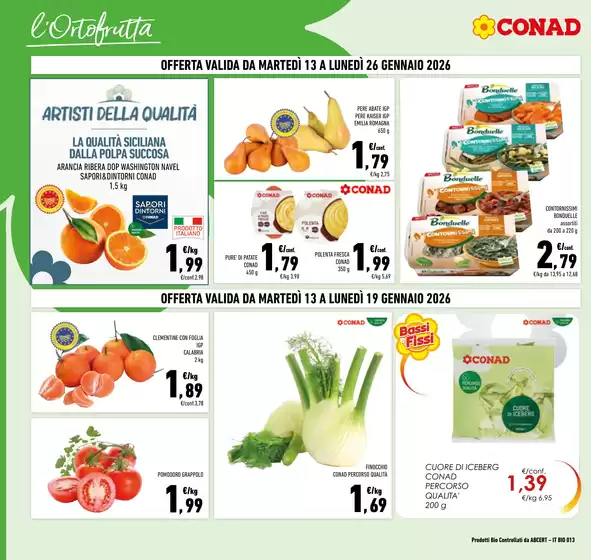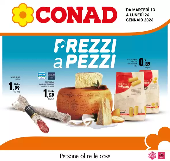 Conad, acronimo di Consorzio Nazionale Dettaglianti, è una società cooperativa fondata a Bologna e attiva dal 1962. Ad oggi Conad presenta oltre 3.000 punti vendita e 5.000 prodotti in assortimento, garantendo ogni giorno qualità e prezzi convenienti alla sua clientela. Conad offre format per ogni esigenza da iper e supermercati a punti vendita di minori dimensioni come Margherita Conad e Todis. Inoltre la clientela Conad può usufruire del servizio di spesa online HeyConad, che permette di ricevere l’ordine direttamente a casa tramite consegna a domicilio o ritirarlo presso uno dei punti vendita. Consulta l’anteprima del volantino Conad disponibile su Tiendeo e scopri maggiori informazioni su promozioni e servizi della catena.
