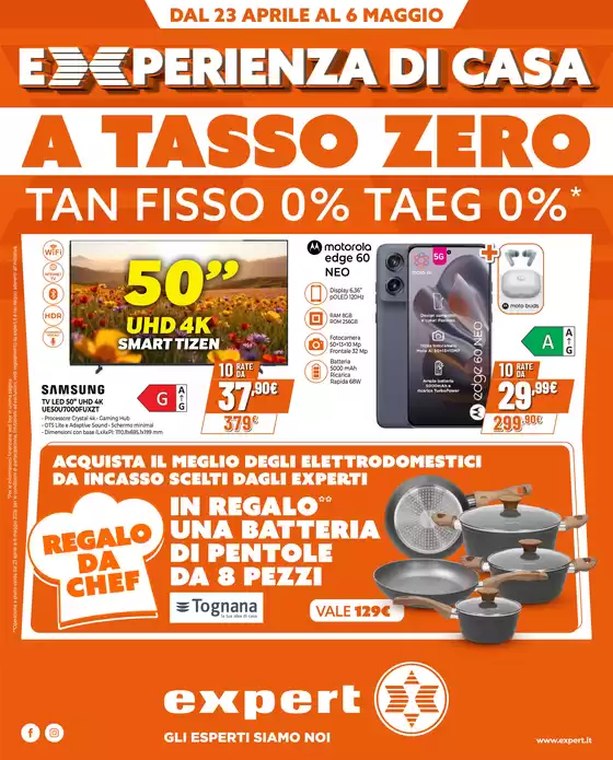 Expert è una catena internazionale con sede svizzera attiva da oltre 60 anni nella vendita di elettronica di consumo. Sia nei punti vendita che su Expert online sono disponibili diversi prodotti, da smartphone e tablet ad elettrodomestici di qualsiasi volume ad apparecchi Hi-Fi. I prodotti in vendita su Expert sono delle migliori marche del settore e sono acquistabili ad un prezzo sempre conveniente e scontato. Consulta il volantino Expert su Tiendeo e scopri oggi tutte le offerte disponibili!