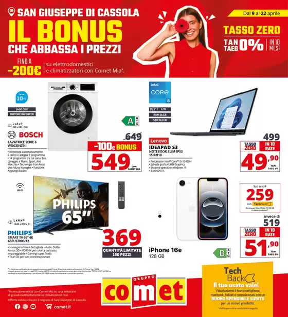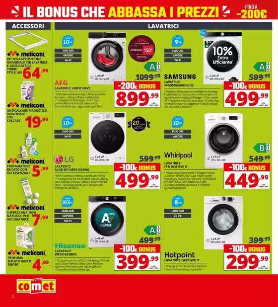 Comet è unazienda italiana con sede a Bologna attiva dal 1967 che offre elettrodomestici ed elettronica di consumo a privati e materiale elettrico a clienti professionali, industria ed enti pubblici. Comet conta più di 100 negozi fisici nel centro e nord Italia e un negozio online, tramite il quale si possono ordinare i prodotti con consegna a domicilio o ritirarli nel punto vendita più vicino. Visualizza il volantino Comet su Tiendeo e non perderti nessuna promozione e novità della catena.