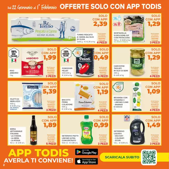 Todis è una catena italiana di supermercati discount, presente soprattutto nel Centro Italia, nata all’interno del mondo Conad. Il catalogo Todis coniuga l’alta qualità dei prodotti ad un vasto assortimento composto da oltre 3.700 referenze di prodotti anche a marchio proprio. Non mancano nell’offerta i prodotti etnici, biologici, salutistici, vegani e per celiaci.