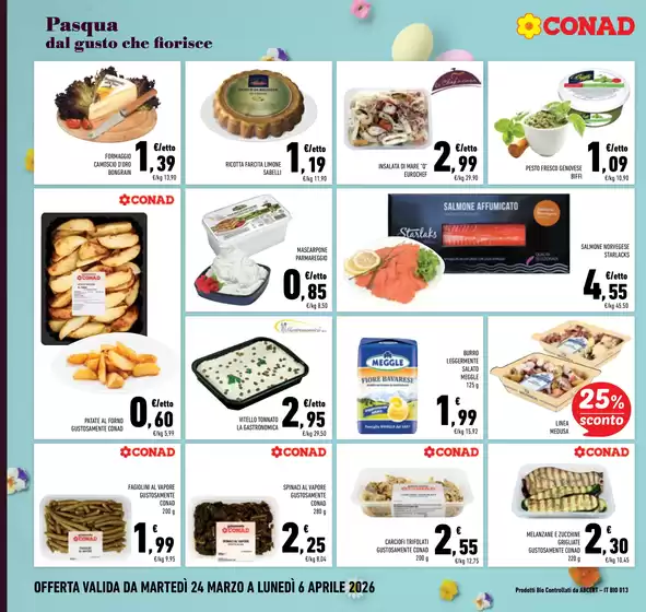 Conad, acronimo di Consorzio Nazionale Dettaglianti, è una società cooperativa fondata a Bologna e attiva dal 1962. Ad oggi Conad presenta oltre 3.000 punti vendita e 5.000 prodotti in assortimento, garantendo ogni giorno qualità e prezzi convenienti alla sua clientela. Conad offre format per ogni esigenza da iper e supermercati a punti vendita di minori dimensioni come Margherita Conad e Todis. Inoltre la clientela Conad può usufruire del servizio di spesa online HeyConad, che permette di ricevere l’ordine direttamente a casa tramite consegna a domicilio o ritirarlo presso uno dei punti vendita. Consulta l’anteprima del volantino Conad disponibile su Tiendeo e scopri maggiori informazioni su promozioni e servizi della catena.