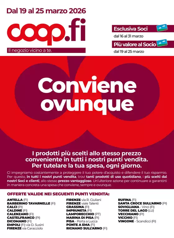 Coop, acronimo di Cooperativa Consumatori è attiva in Italia dal 1969, fornendo un’ampia gamma di prodotti da alimentari a elettrodomestici a prezzi sempre convenienti. Attualmente sono presenti nella penisola ben 1300 punti vendita tra iper e supermercati. Oltre al servizio di spesa in loco e online la cooperativa offre diversi servizi tra cui operatore di telefonia mobile, librerie e stampa foto digitali. Consulta ora tutte le offerte nel volantino Coop presente su Tiendeo e approfitta subito di promozioni incredibili su vari articoli.