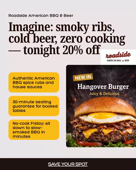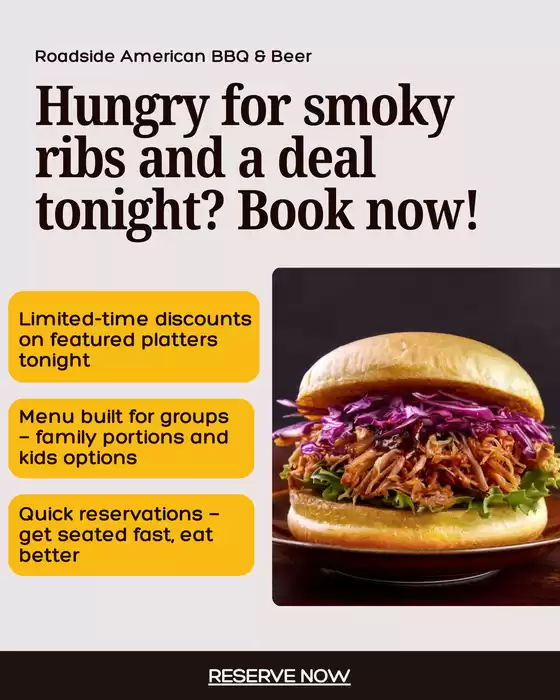 Non perdere le offerte di Roadside American BBQ a Villasanta e rimani aggiornato sui migliori prezzi durante aprile 2026. Su Tiendeo troverai sempre le migliori opportunità di acquisto a Villasanta. Esplora subito le incredibili promozioni che abbiamo preparato per te!